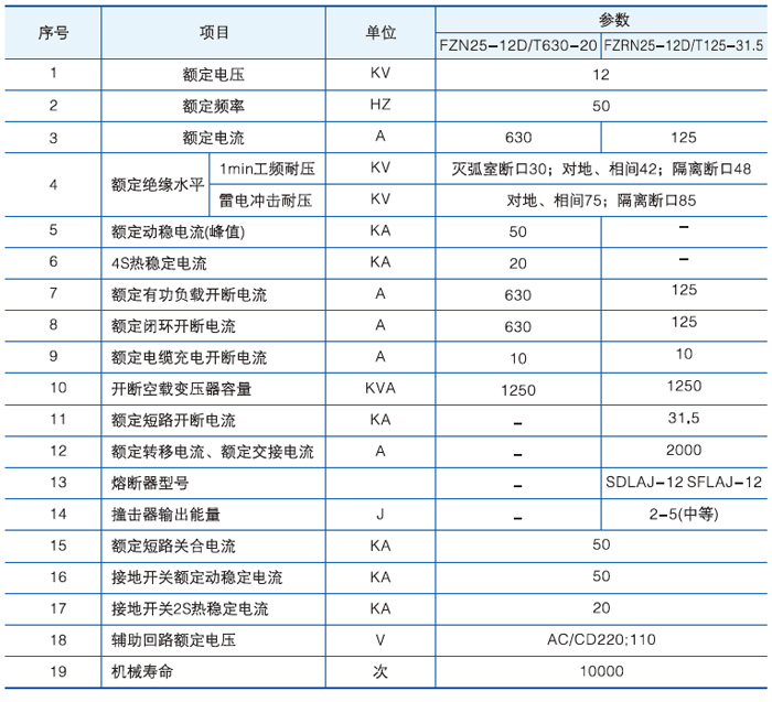 FZN25、FZRN25型真空負荷開關和組合電器,適用三相交流50Hz環(huán)網或終端供電和工業(yè)用電設備中,作負荷控制和短路保護之用,負荷開關分合負荷、閉環(huán)電流、空載變壓器和電纜充電電流。組合電器可以開斷直至額定短路電流的任何電流。采用直動式隔離斷口和真空弧室聯動。具有手動和電動功能。